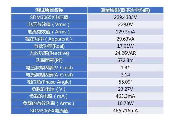 為驗證負載的實際功率。我們把SDM3065X作為電流表接入到負載電路中,如圖6所示;同時把高壓差分探頭和電流探頭接入到負載電路中。在功率分析中,選擇電壓均方根、電流均方根、有效功率。結(jié)果如圖7所示: