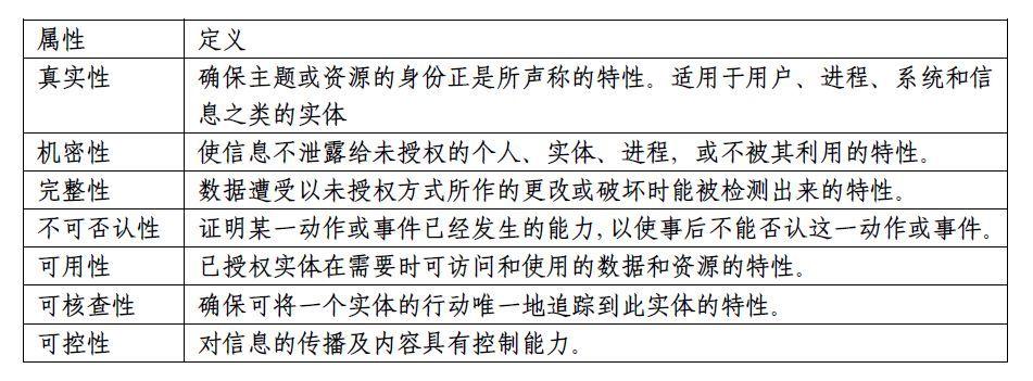 信息安全是指對信息系統(tǒng)的硬件、軟件、系統(tǒng)中的數(shù)據(jù)及依托其開展的業(yè)務(wù)進(jìn)行保護(hù),使得它們不會由于偶然的或者惡意的原因而遭到未經(jīng)授權(quán)的訪問、泄露、破壞、修改、審閱、檢查、記錄或銷毀,保證信息系統(tǒng)連續(xù)可靠地正常運(yùn)行。信息安全具有真實(shí)性、機(jī)密性、完整性、不可否認(rèn)性、可用性、可核查性和可控性七個主要屬性: